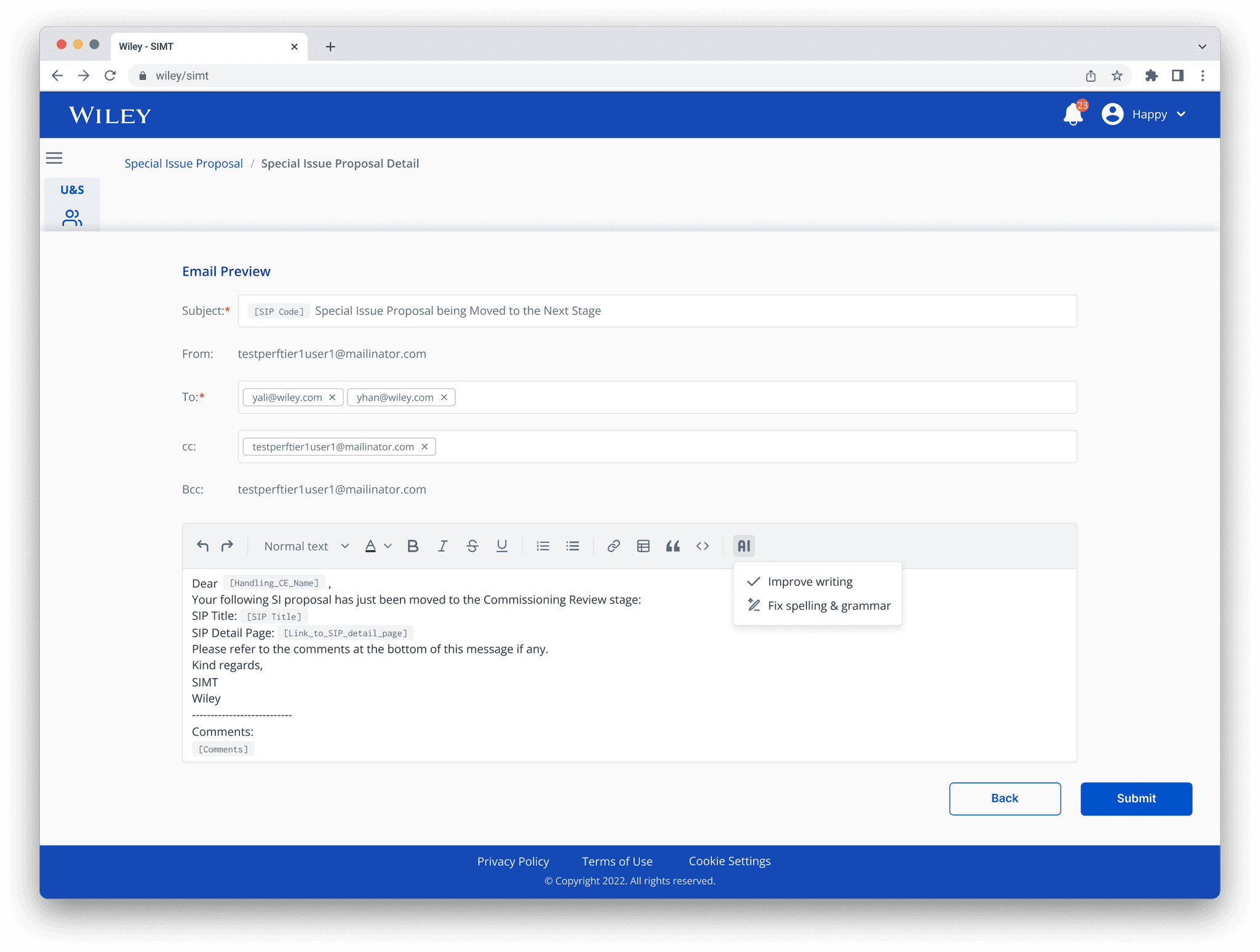 To address these pain points, I enhanced the “Special Issue Proposal Detail” page by introducing a new email template feature after comparing the initial ideations on an impact-feasibility matrix and a discussion with the Product Owner about the content requirements.
